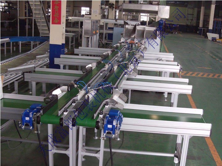 結(jié)構(gòu)形式有:槽型皮帶機、平型皮帶機、爬坡皮帶機、轉(zhuǎn)彎皮帶機等多種形式,輸送 帶上還可增設(shè)提升擋板、裙邊等附件,能滿足各種工藝要求。輸送機兩側(cè)配以工作臺、加裝燈架,可作為電子儀表裝配,食品包裝等裝配線。